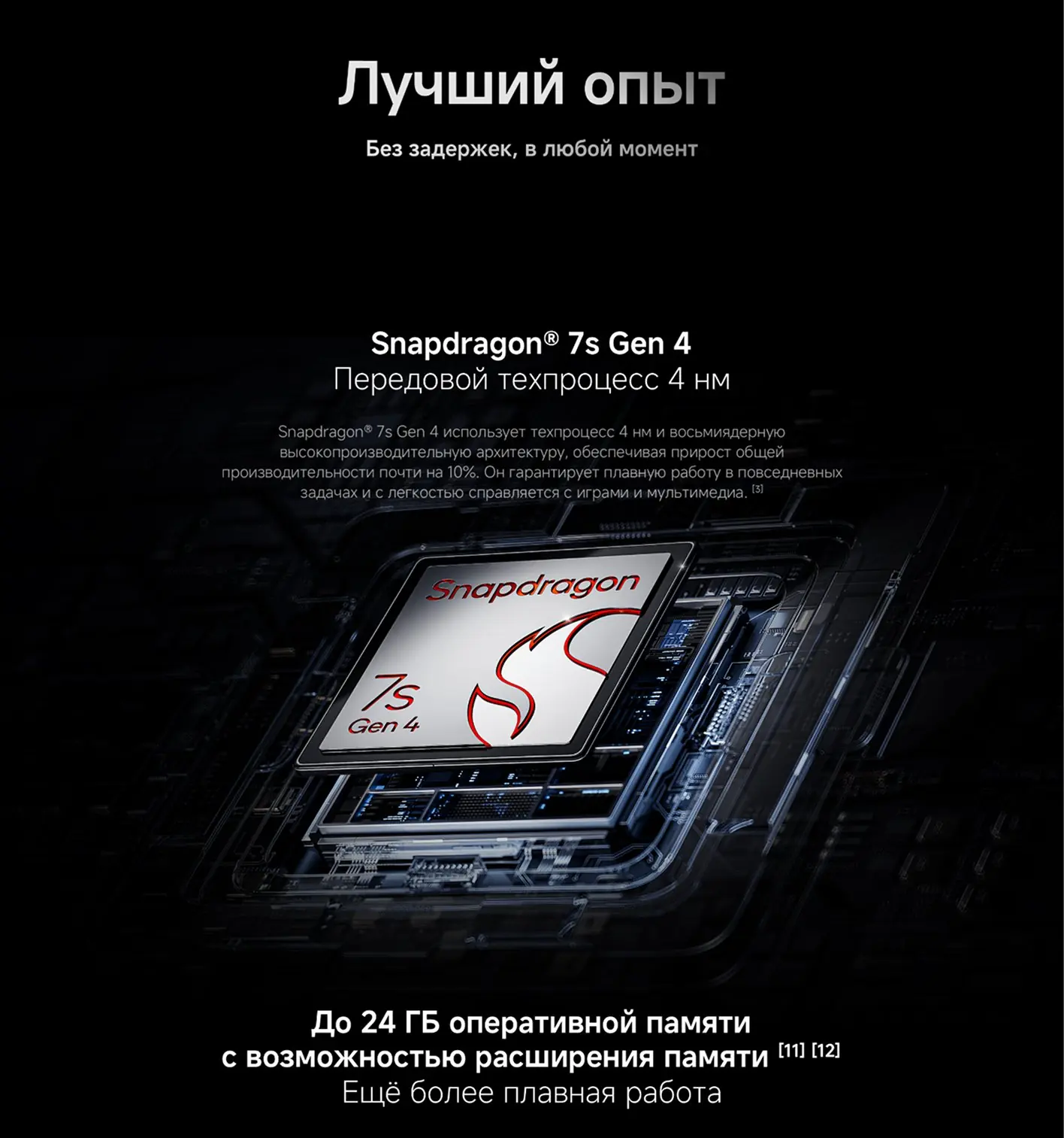 - Процессор Qualcomm Snapdragon 7s Gen 4 (4 нм), 8 ядер до 2.7 ГГц, Adreno 810