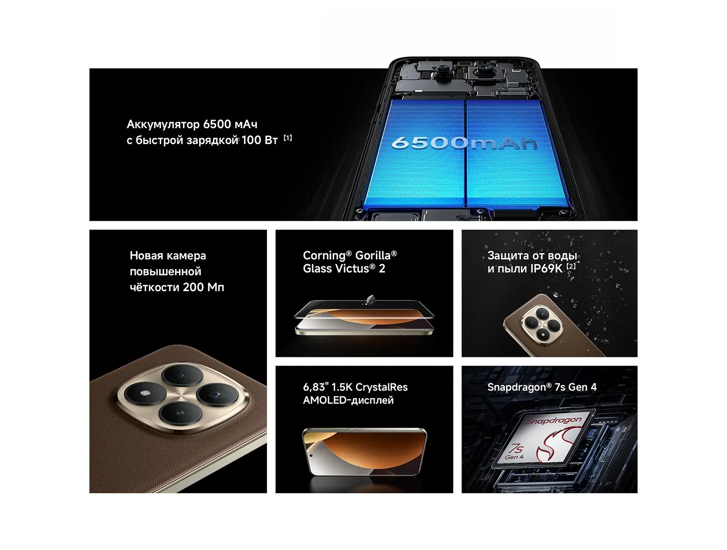 - Аккумулятор 6500 мА·ч (Si-C), быстрая зарядка 100 Вт; ЗУ в комплекте